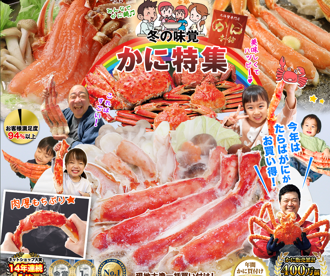 - ラインナップが豊富:ズワイ・タラバ・毛ガニほか、姿・脚・肩、ボイル・生・半むき身・フルポーションなど形状も多彩。鍋・しゃぶ・焼き・カニすきなど食べ方に合わせて選べます。