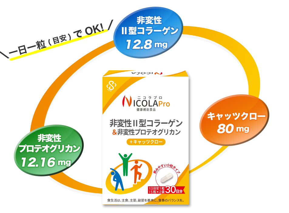 ニコラプロは、非変性Ⅱ型コラーゲン×非変性プロテオグリカン×キャッツクローという“関節ファースト”の設計で、毎日の動作を快適に保つための続けやすいサプリ。飲むタイミングを固定し、歩く・伸ばすなどの軽運動と合わせて、数週間〜数か月のスパンで変化を見守る――そんな現実的な運用が、日々のコンディションづくりの近道です。