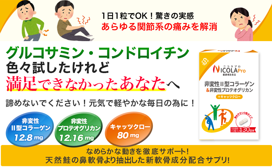 ニコラプロは、非変性Ⅱ型コラーゲン×非変性プロテオグリカン×キャッツクローという“関節ファースト”の設計で、毎日の動作を快適に保つための続けやすいサプリ。飲むタイミングを固定し、歩く・伸ばすなどの軽運動と合わせて、数週間〜数か月のスパンで変化を見守る――そんな現実的な運用が、日々のコンディションづくりの近道です。