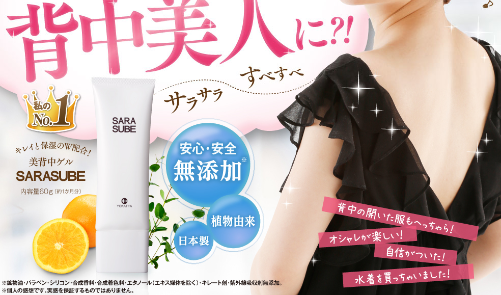 SARASUBEは、背中ケアを毎日のルーティンに落とし込むための実用性に特化した美背中ゲル。速乾の軽い質感、広範囲でも塗りやすいのび、チューブの衛生性——どれも“続けやすさ”に直結します。入浴後に30秒で塗る。この小さな積み重ねが、数週間後の“見せたくなる背中”への近道です。購入前には内容量・価格・成分・使用部位を確認し、ご自身の生活動線に合う形でスタートしましょう。
