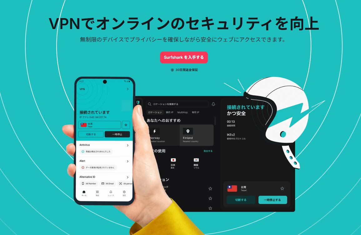 ネットショッピング、動画視聴、カフェのフリーWi-Fiなど、私たちの毎日はオンラインに結びついています。Surfsharkは通信を暗号化し、IPアドレスを隠すことで、日々のオンライン行動を静かに守るVPNです。同時接続の台数無制限で、スマホ・PC・タブレット・テレビまで家中のデバイスをまとめて保護できます。