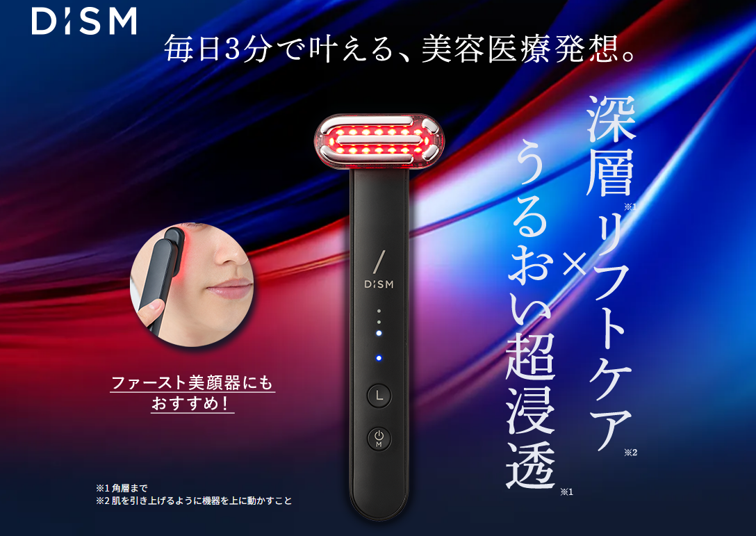 化粧品だけのケアに物足りなさを感じたら、表情筋アプローチと角質層ケアを両立できるホームデバイスが近道です。DISM EMS EER メディスキンケアデバイスは、電気刺激で表情筋に働きかけるEMSと、うるおいケア・浸透(角質層まで)をねらうEERを一台に搭載。毎日数分で、フェイスラインからうるおいまで多面的に支えます。※医療機器ではありません。