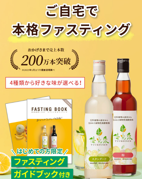 優光泉(ゆうこうせん)は、断食の現場を知る専門家が開発した原液100%の酵素ドリンク。野菜・果物・海藻などの発酵エキスを濃縮し、水や炭酸で割るだけで活用できます。完全断食は不安でも、エネルギーと風味を補いながら取り入れやすいのが特長です。※配合・アレルゲン等は商品ラベルをご確認ください。
