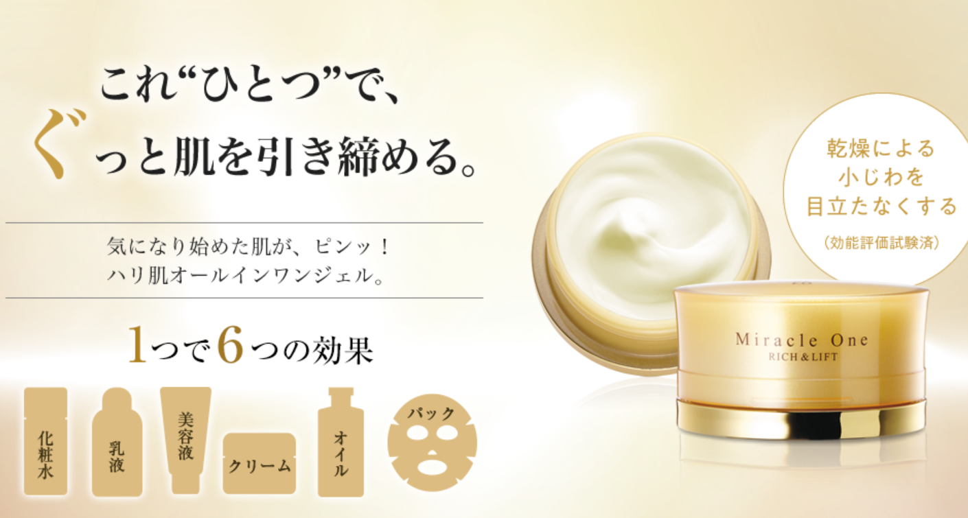 RF28 ミラクルワン リッチ&リフトは、化粧水・美容液・乳液・クリーム・パックなどの機能を1つにまとめたオールインワンジェルです。さらに美容オイルを配合することで、肌にうるおいとハリを与える設計となっています。