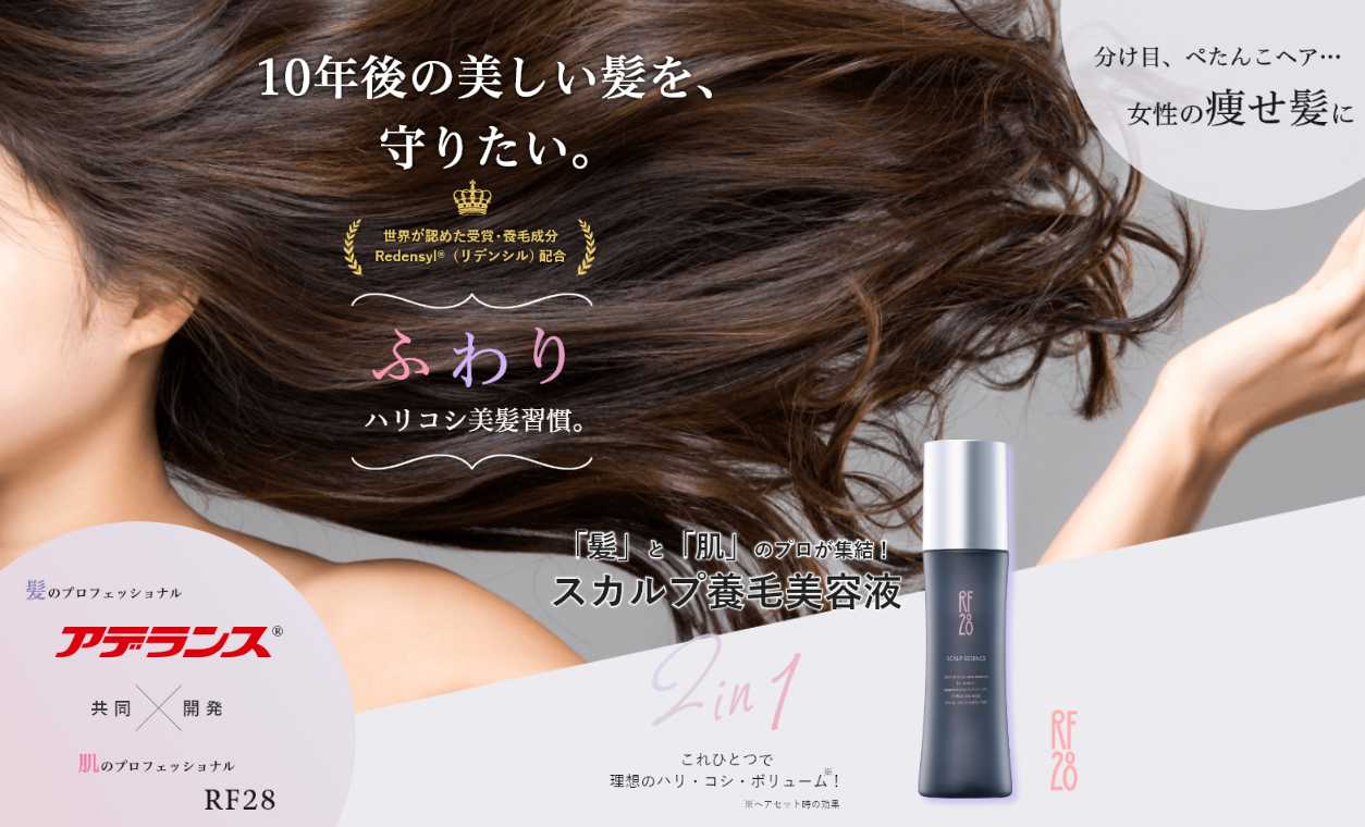 髪のボリュームやハリ・コシの変化が気になり始めた方へ。毎日のケアで頭皮環境を整えることは、美しい髪を育てるための大切なステップです。「RF28スカルプエッセンス」は、スキンケア発想と毛髪研究の知見を掛け合わせて開発された女性向けスカルプケアアイテムです。