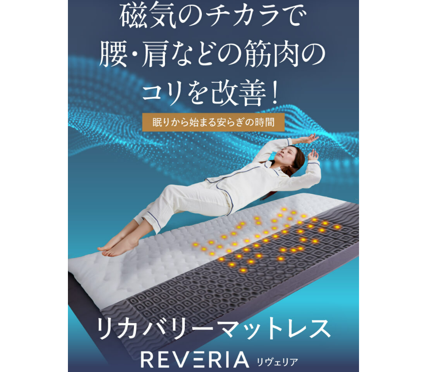 そこで注目されているのが、「REVERIAリカバリーマットレス」。医療機器認証を取得した設計により、睡眠中に身体をサポートし、筋肉のコリの改善を目指す新しいタイプのマットレスです。