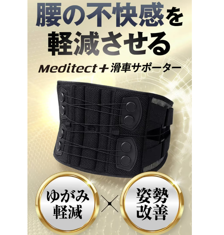メディテクト腰ベルトは、装着するだけで腰をしっかりと支え、負担を軽減するために設計されたサポートアイテムです。